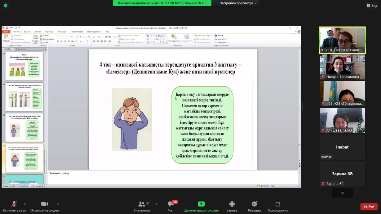 №58 жалпы білім беретін мектебінде 2021 жылдың 13-қараша күні өткен «4-сынып оқушыларының 5-сыныпқа ауысқан кездегі білім сапасының төмендеуінің себептері мен күресудің жолдары» тақырыбында 5-6 сынып ата-аналар жиналысы өтті. Мақсаты: оқушылардың оқуға қызығушылығын арттыру әдістерімен бөлісу, білім берудегі кинесология туралы түсінік беру.