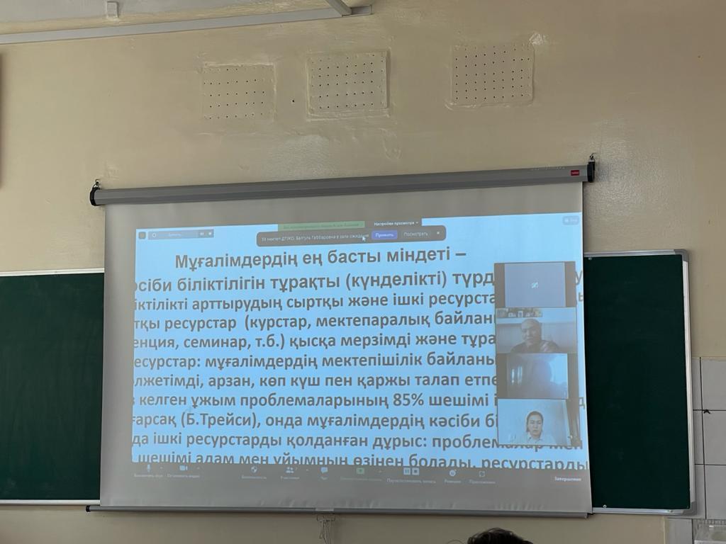 2021 жылдың 05. қазан күні №58 Жалпы білім беретін мектептің ұжымымен «Назарбаев зияткерлік мектептері» ДББҰ жанындағы Педагогикалық шеберлік орталығында аға менеджері. Филология ғылымдарының кандидаты, доценті Алимов Асхат Хамзатұлы «Сабақты зерттеу қадамдары» атты тақырыпта вебинар өткізді. Вебинарда пән мұғалімдерін толғандырып жүрген сұрақтарға , жауабын алды.