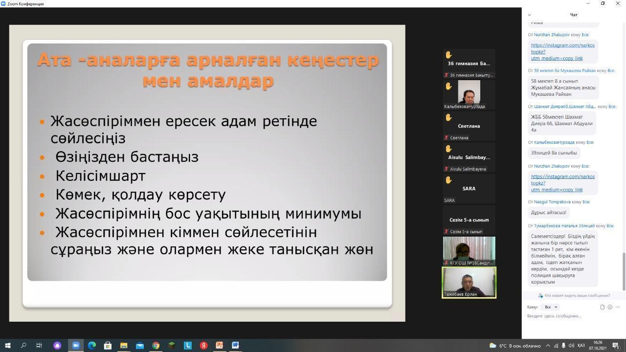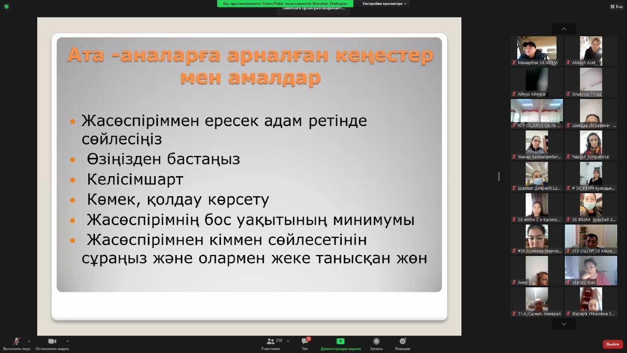 №58 жалпы білім беретін мектепте «Нашақорлықтың алдын алу» мақсатында ата-аналармен онлайн форматта түсіндірме жұмыстары жүргізілді. Нашақорлықпен күресу, оның түрлері, оны қалай анықтау, есірткі сату барысында жауапкершілікке тарту, оқушының нашақорлыққа әуестік белгілері жайында толықтай ақпарат берілді.