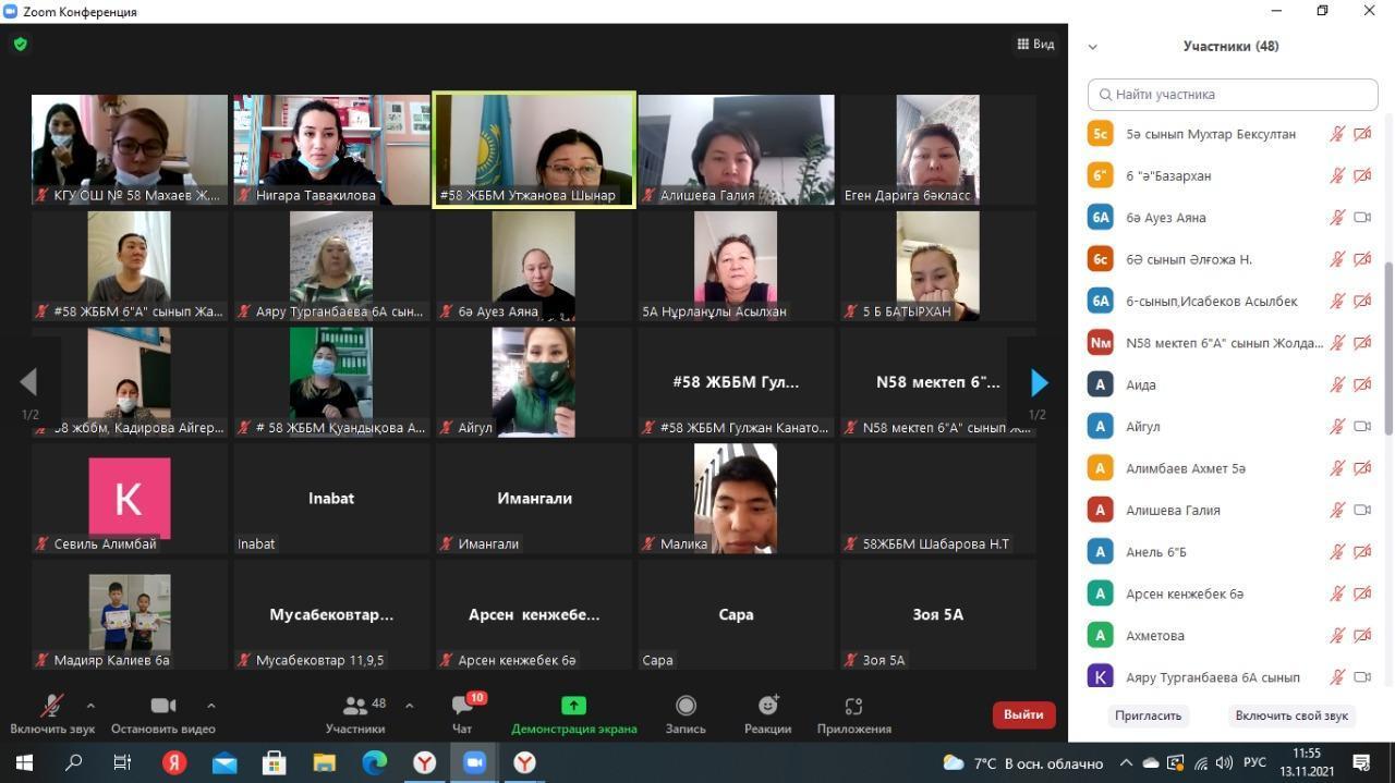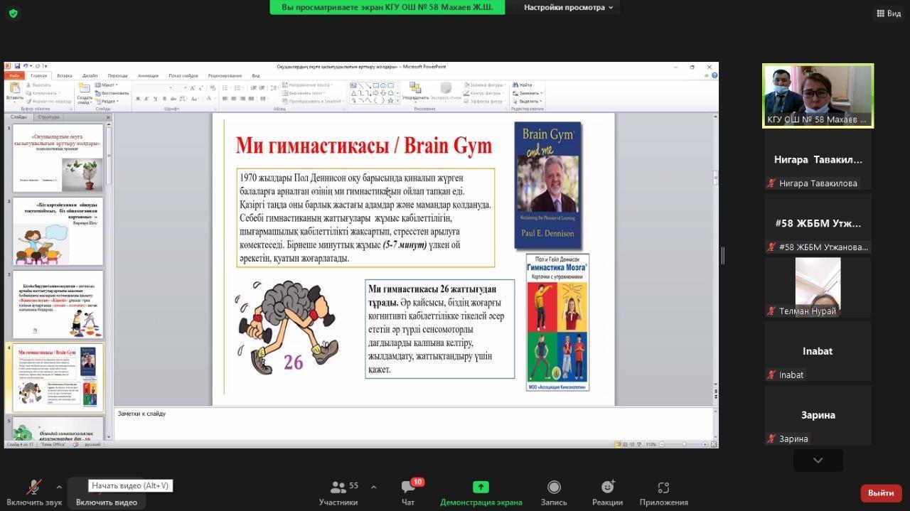 №58 жалпы білім беретін мектебінде 2021 жылдың 13-қараша күні өткен «4-сынып оқушыларының 5-сыныпқа ауысқан кездегі білім сапасының төмендеуінің себептері мен күресудің жолдары» тақырыбында 5-6 сынып ата-аналар жиналысы өтті. Мақсаты: оқушылардың оқуға қызығушылығын арттыру әдістерімен бөлісу, білім берудегі кинесология туралы түсінік беру.