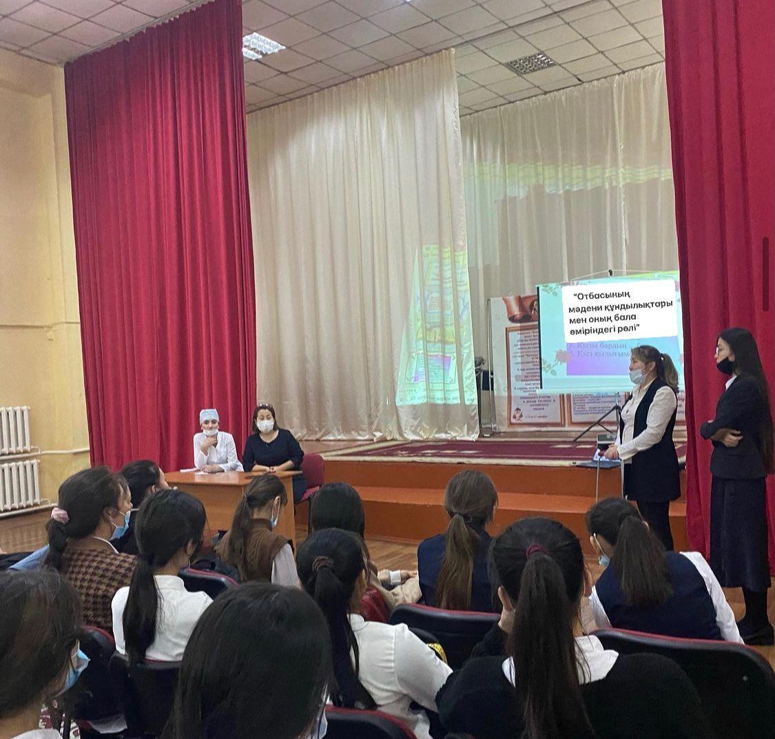 "Отбасының мәдени құндылықтары мен оның бала өміріндегі рөлі" тақырыбында оқушылармен еркін әңгімелесу болды. Мектеп оқушылары өз пікірлерімен бөлісіп, өз жағдаяттарын ортаға салды. Әңгіме барысында балаға отбасыдағы мәдениеттің ықпалымен қатар қоғамның да тигізер ықпалы басым екендігі айтылды.