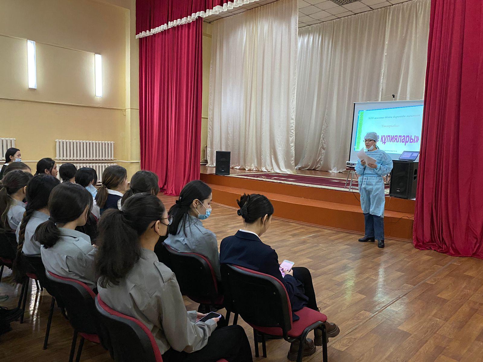 №58 ЖББМ 8-10 сынып қыздарының қатысуымен КГП и ПХВ ГП к8 дәрігер, акушер-гинеколог Жуманиязова Махаббат Амангельдиевамен “Дене құпиялары” тақырыбында арнайы кездесу өтті. Кездесуге ДТЖО, мектеп психологы, мектеп тәлімгері қатысты. Кездесу барысында қыздар өз сұрақтарын қойып, пайдалы мәліметтер алды.