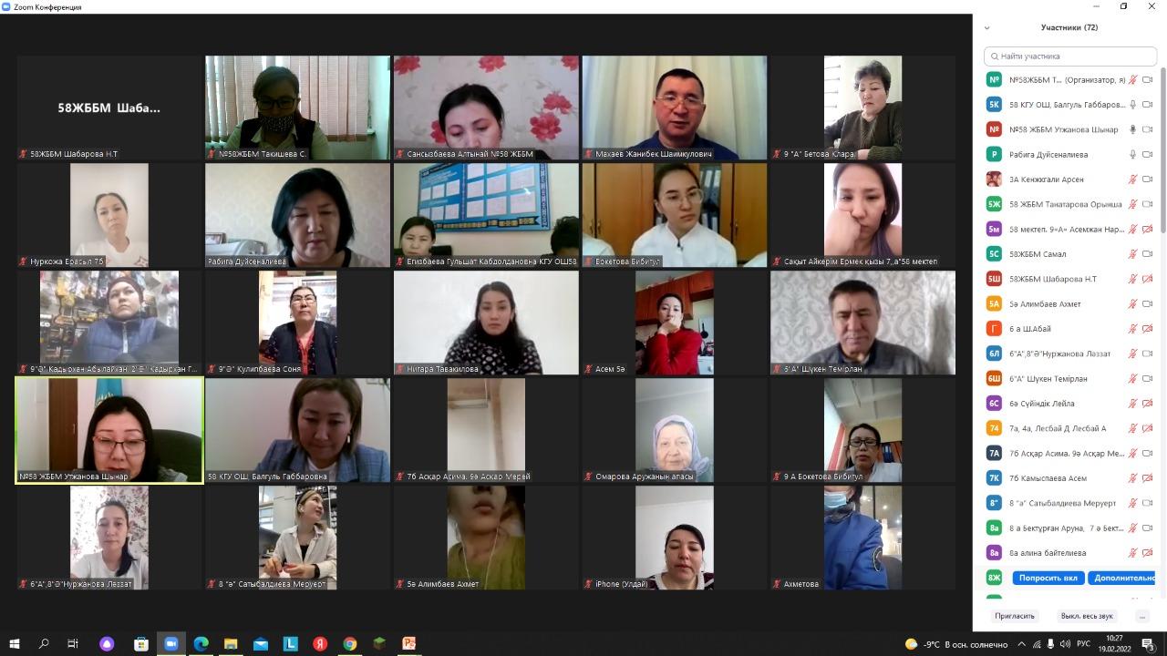 19.02.2022 жылы №58 ЖББМ «Директорлық сенбі – ата-ана үні» онлайн кездесуі өтті. Жианлыста « Мектеп оқушыларының функционалдық сауаттылығы нені қамтиды, ол қалай қалыптасады?», « Салауатты өмір салты» тақырыптары талқыланды. Ата-аналар ұсыныстары тыңдалып, қойылған сұрақтарға жауап берілді.