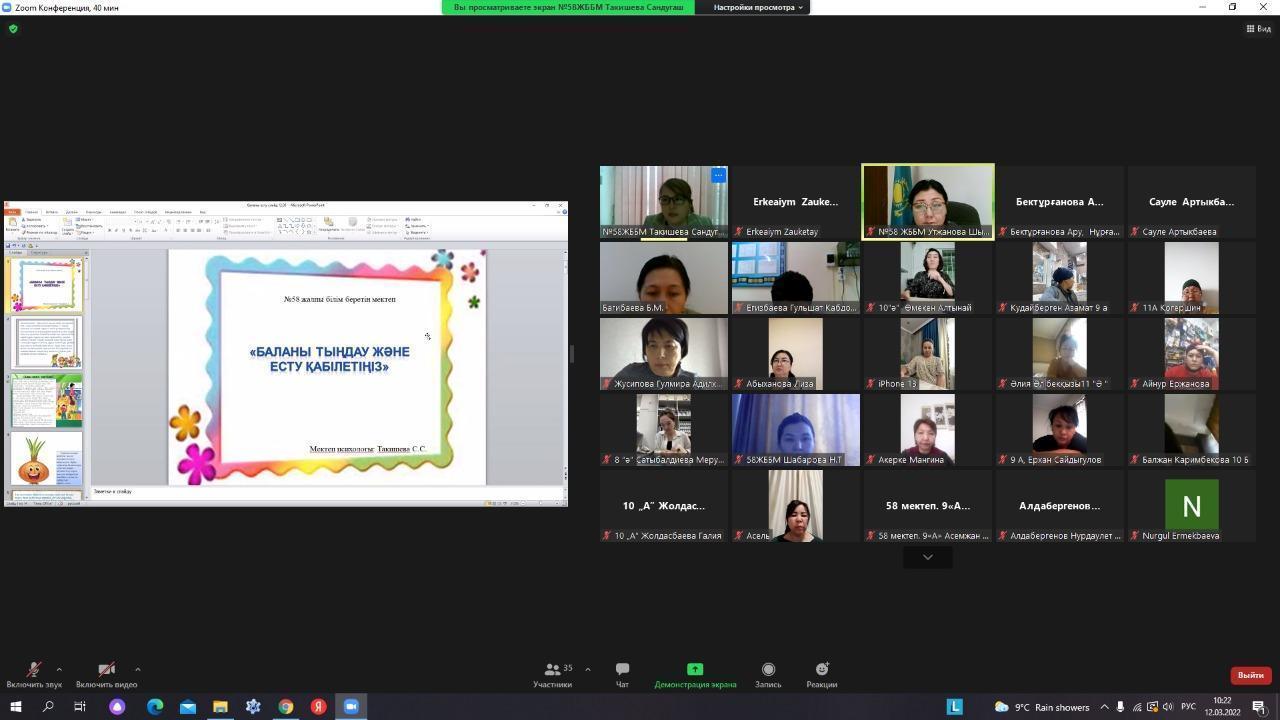 №58 ЖББМ «Директорлық сенбі – ата-ана үні» онлайн кездесуі өтті. Жиналыста «Компьютерлік ойындар - шындықтан қашу ма, әлде баланың танымдық белсенділігін дамыту ма?», « Баланы тыңдау және есту қабілетіңіз» тақырыптарында баяндама жасалды. Ата-аналар ұсыныстары тыңдалып, қойылған сұрақтарға жауап берілді.