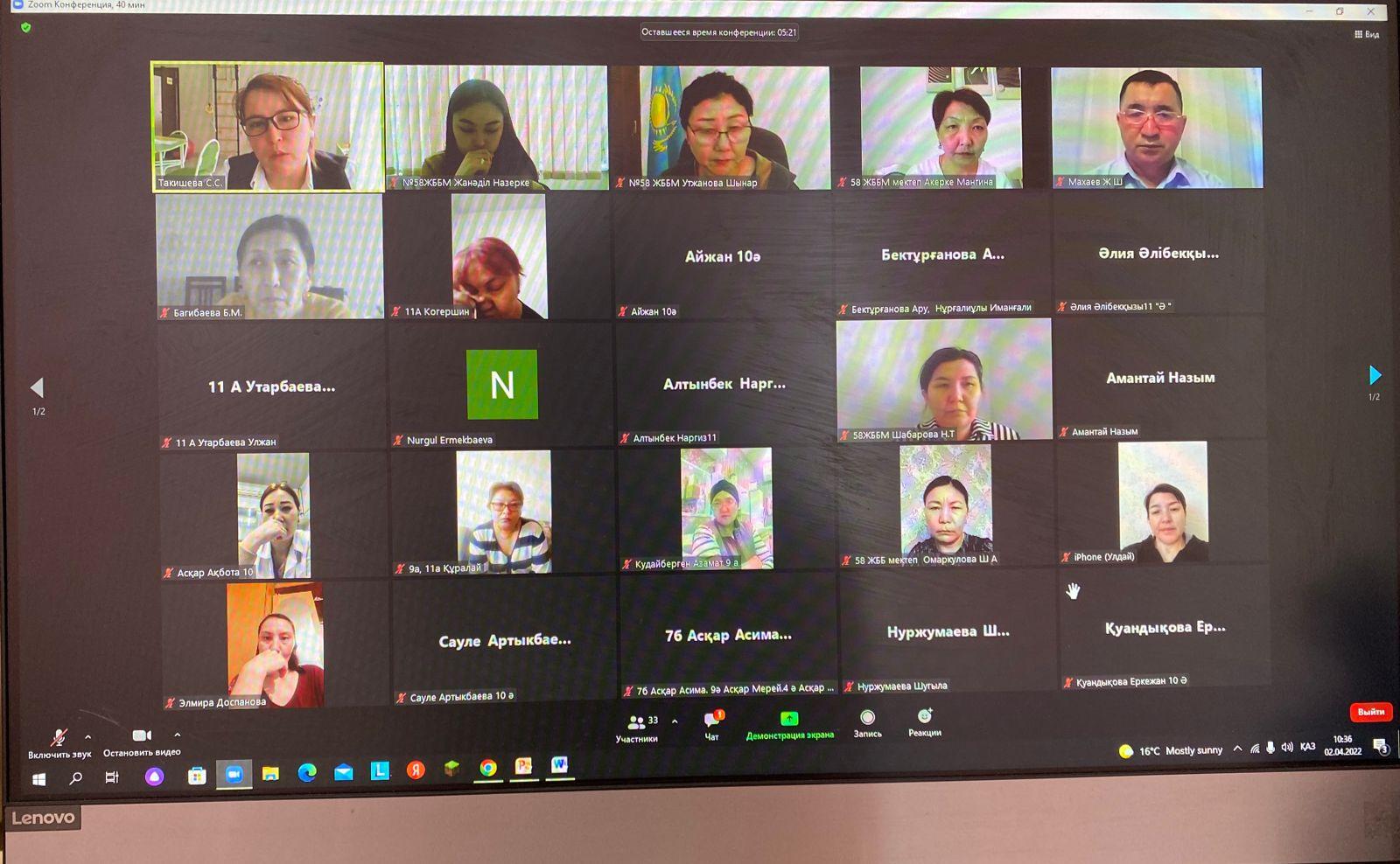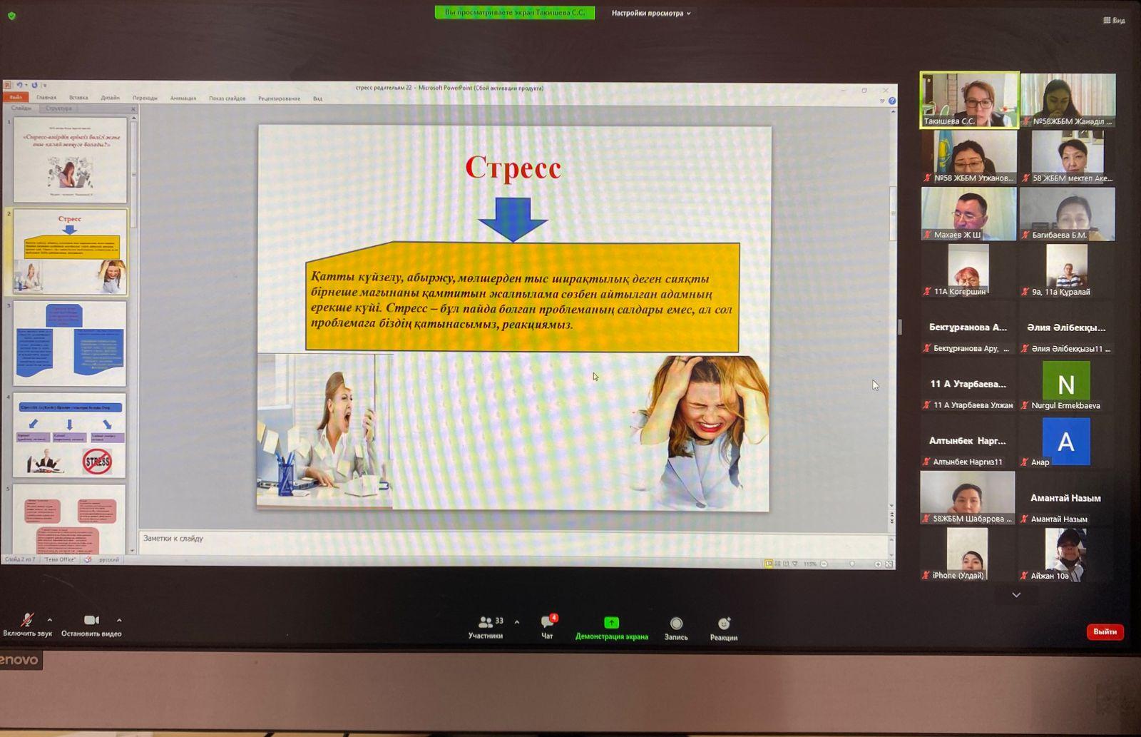 02.04.2022 жылы №58 ЖББМ «Директорлық сенбі – ата-ана үні» онлайн кездесуі өтті. Жиналыста «Балаларыңызға ынталана оқуға қалай көмектесе аласыз?»,«Стресс-өмірдің еріксіз бөлігі және оны қалай жеңуге болады?» тақырыптарында баяндама жасалды. Ата-аналар тарапынан қойылған сұрақтарға жауап берілді.