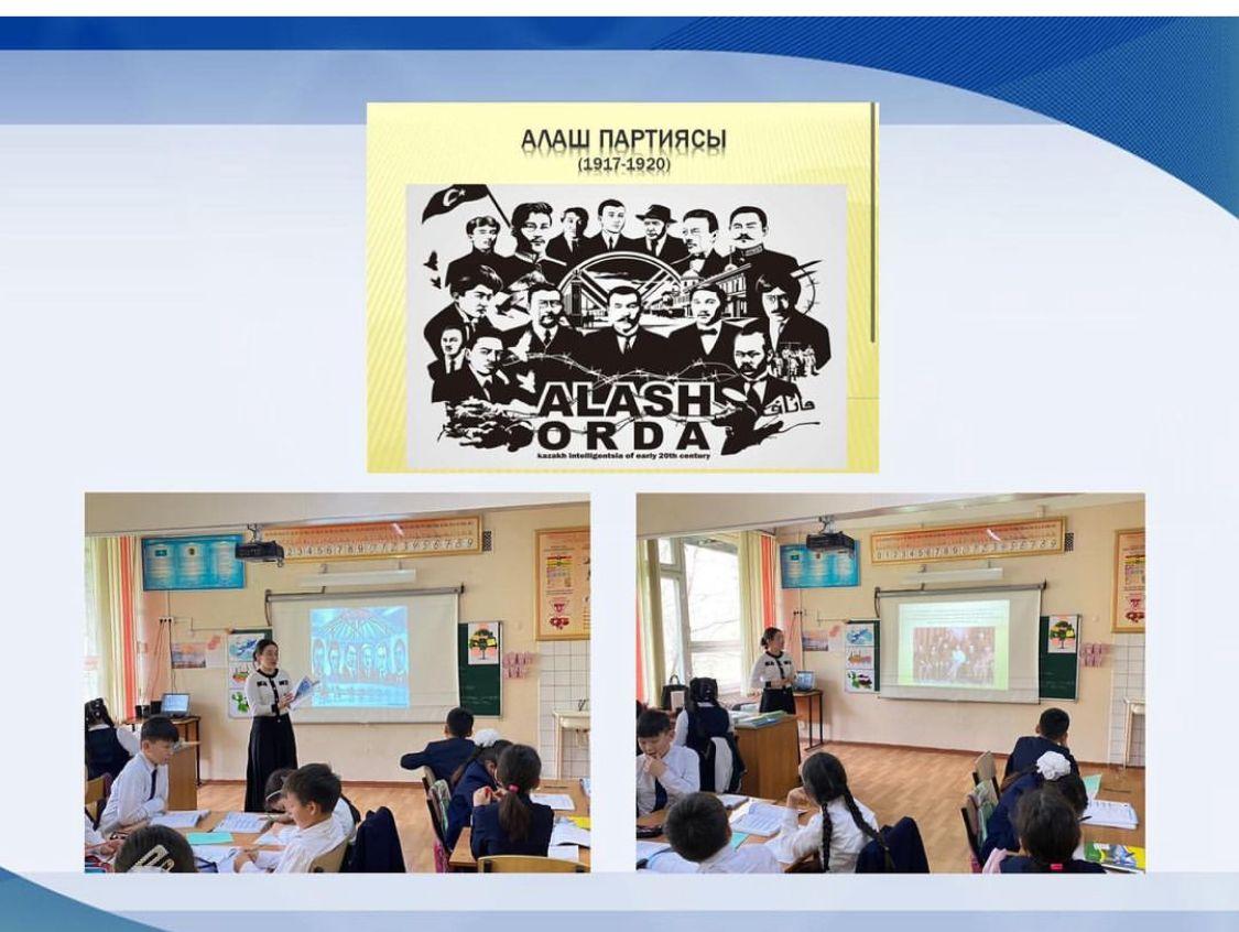 № 58 ЖББМ 5-сынып оқушыларына қазақ халқының ғасырлар бойы өткен қиыншылықтарын айта келіп, осы зұлмат жылдары елінің азаттығын аңсаған ұлт зиялыларына тоқталу, өз елін, жерін қорғайтын ұрпақ тәрбиелеу мақсатында тәрбие сағаты өткізілді.✅