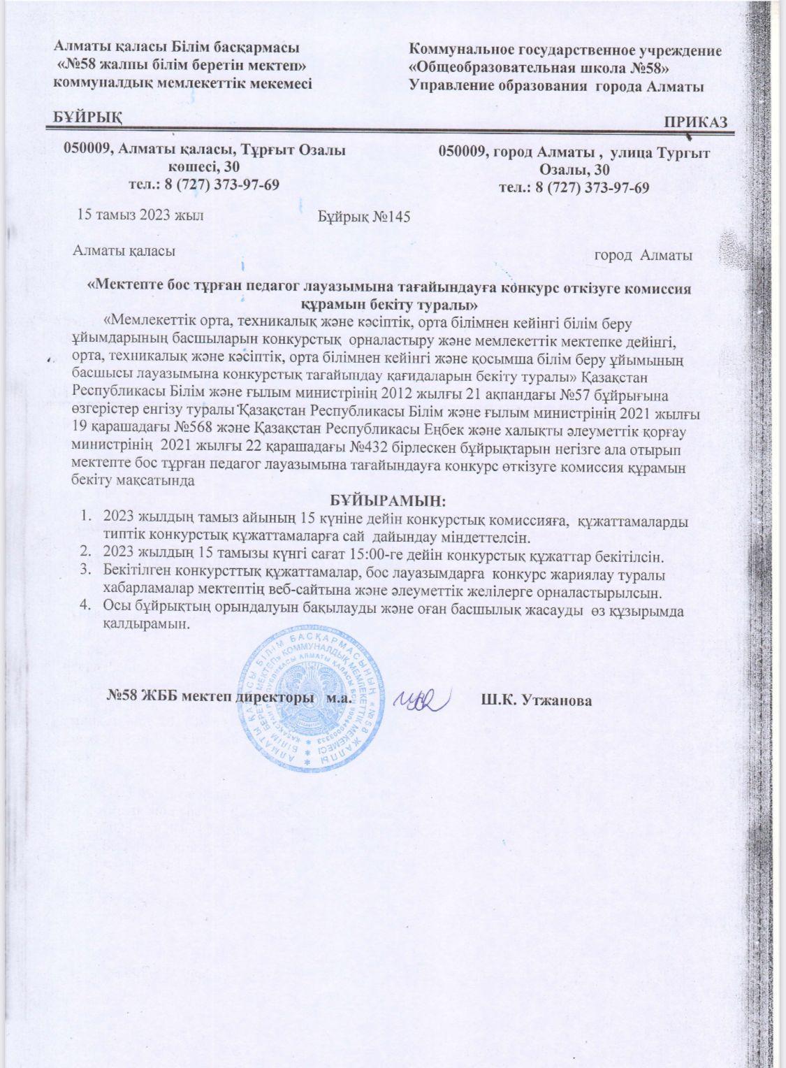 Алматы қаласы Білім басқармасы «№58 жалпы білім беретін мектеп» КММ төмендегідей бос лауазымдар бойынша конкурс жариялайды: