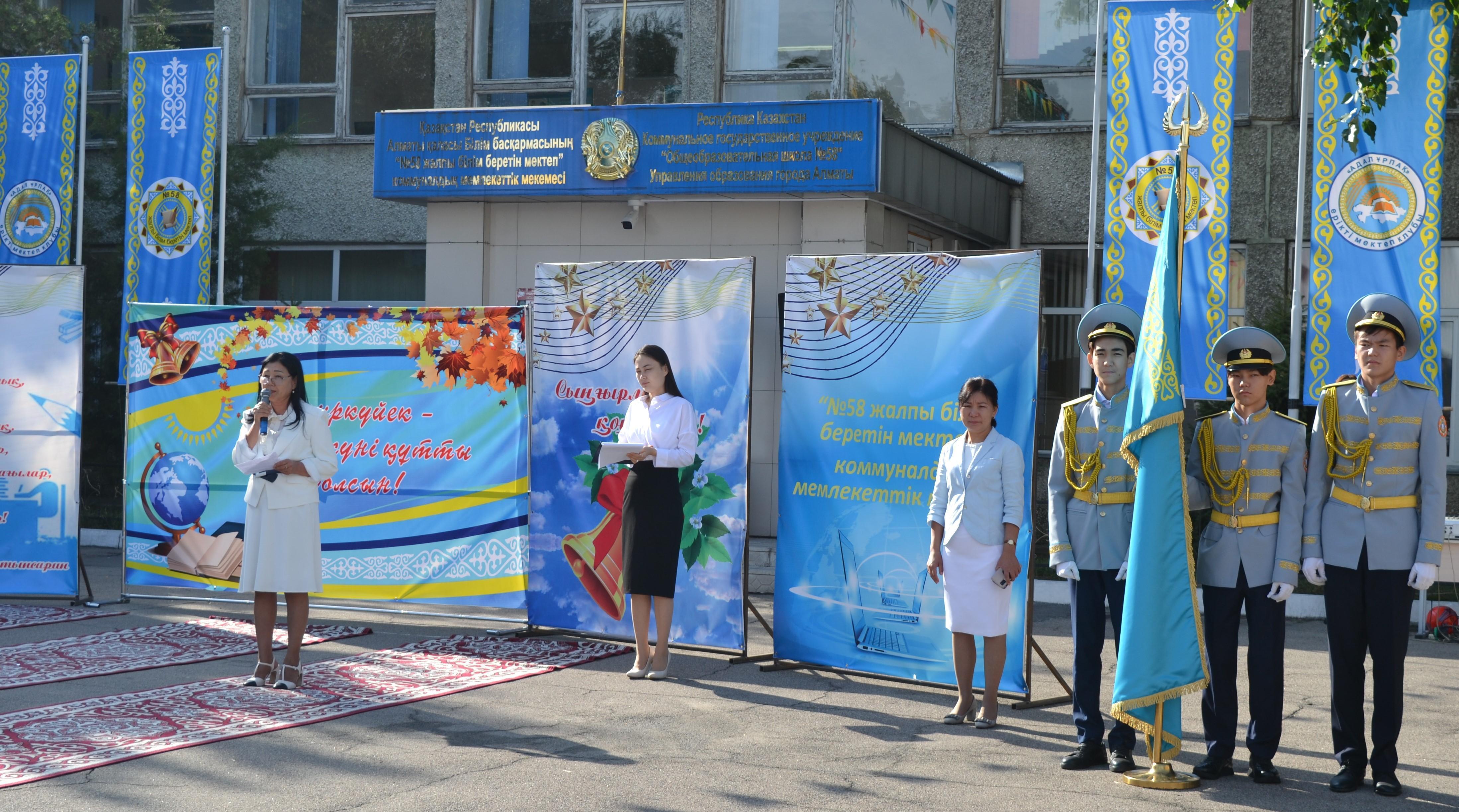 № 58 жалпы білім беретін мектептің табалдырығын алғаш аттаған бүлдіршіндерге және білім алушыларға арналған алғашқы қоңырау салтанатты жиын өткізілді. Мектеп директоры Ш. К. Утжанова мектепе табалдырығын алғашқы аттағалы отырған бүлдіршіндерді, ұстаздар қауымын, ата – аналарды, оқушыларды білім күнімен құттықтады. Мемлекет басшысының алдыңғы білім саласындағы 20-тақырыптық бағыттағы тапсырмасының бірі - Әділетті Қазақстан: сапалы білім, адал ұрпақ , табысты ұлт болатындығына , адал ұрпақ тәрбиелеу-қай уақытта болса да маңыздылығын жоғалтпаған мәселе екендігіне тоқталды.