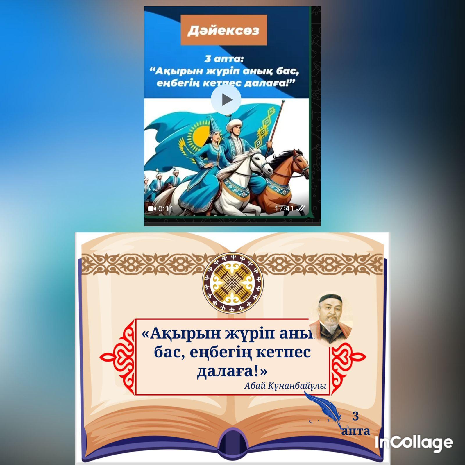 16 сентябрь 2024 0 1 2 3 4 5 "Біртұтас тәрбие" бағдарламасы аясында "Еңбекқорлық және кәсіби біліктілік" айлығындағы аптаның дәйек сөзіне бейнеролик жасалды.