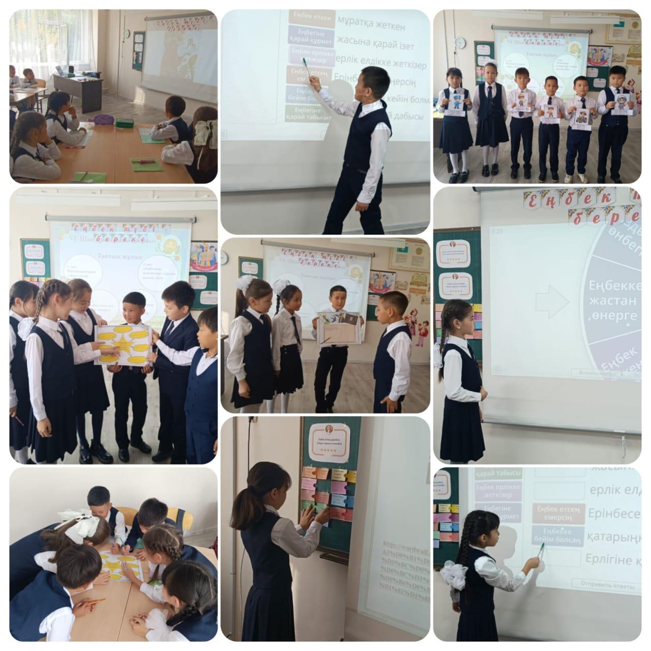 Д.А. Шуиншалиева 4 Ә сынып оқушыларымен «Еңбек түбі – береке» тақырыбында ашық тәрбие сағатын өткізді. Тәрбие сағатының мақсаты: оқушыларға еңбектің адам өміріндегі маңыздылығын түсіндіру, еңбектенуге, адал еңбекті бағалауға баулу.