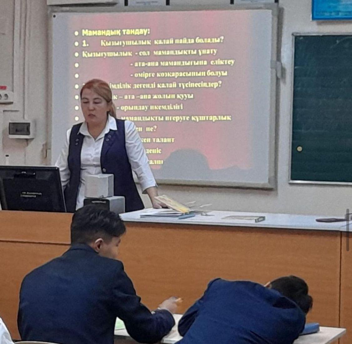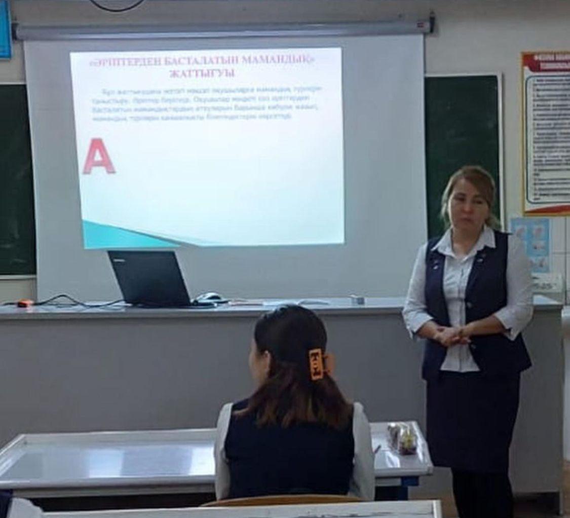 Мақсаты: Оқушыларға мамандықтың түрлері, адам өміріндегі маңызы туралы түсінік бере отырып, өз бейіміне сәйкес мамандық таңдай білуіне ықпал жасау, кәсіби бағдар беру. Тренинг барысында әр оқушының таңдаған мамандығын анықтау мақсатында сұрақ-жауап әдісі қолданылды. Оқушылар ойларын еркін айтып, өз сұрақтарына жауап алды.