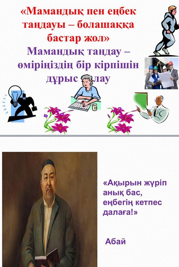 17 қараша күні 10-сынып оқушыларымен директордың тәрбие ісі жөніндегі орынбасары Махаев Жанибек Шайымқұлұлы мен кәсіби бағдар беру бойынша маманы Алимашов Тұрсынбек Серікұлы кәсіби бағдар бойынша түсіндірме жұмыстарын жүргізді.Сонымен қатар, қаламыздағы жоғары оқу орындарына ғылыми-ақпараттық саяхат-сабағы жобасының жүзеге асатындығын тілге тиек етті.