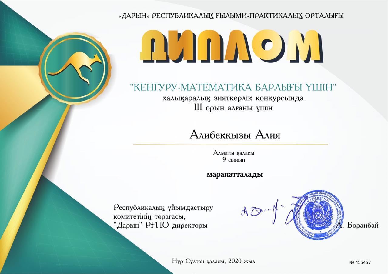 Дарын” Республикалық ғылыми-практикалық орталығы ұйымдастырған “Кенгуру-математика барлығы үшін” халықаралық зияткерлік конкурсында ІІІ орын алғаны үшін Алибекқызы Алия, Нурланулы Ислам, Серпін Айша марапатталды!!! Жеңісті күндерің көп болсын!