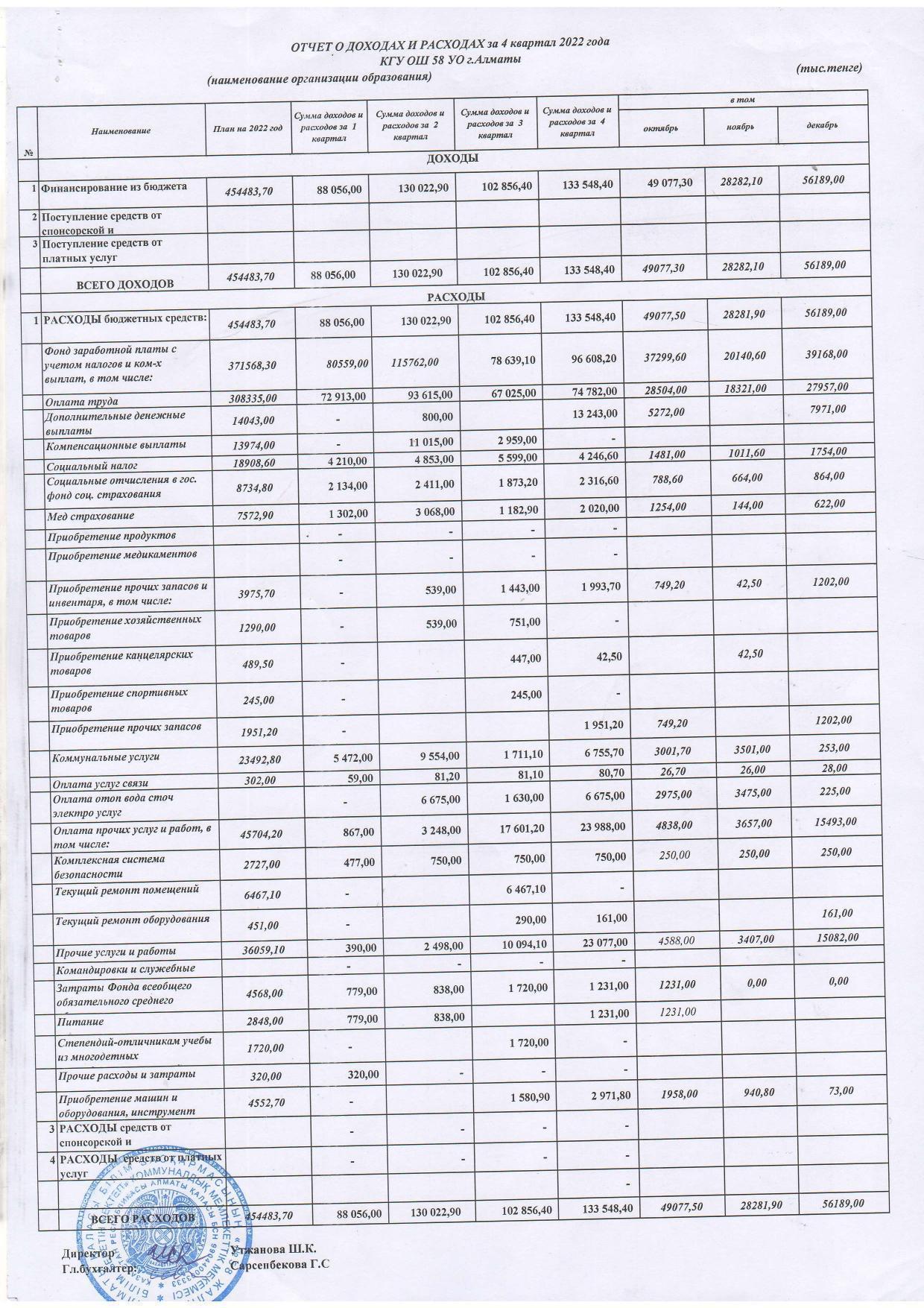«№58 жалпы білім беретін мектеп» коммуналдық мемлекеттік мекемесі директорының қаржылық-шаруашылық қызметі туралы есебі